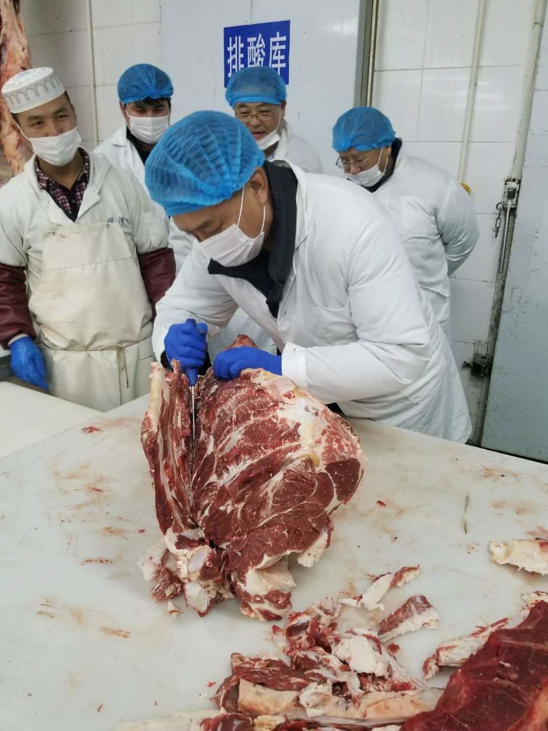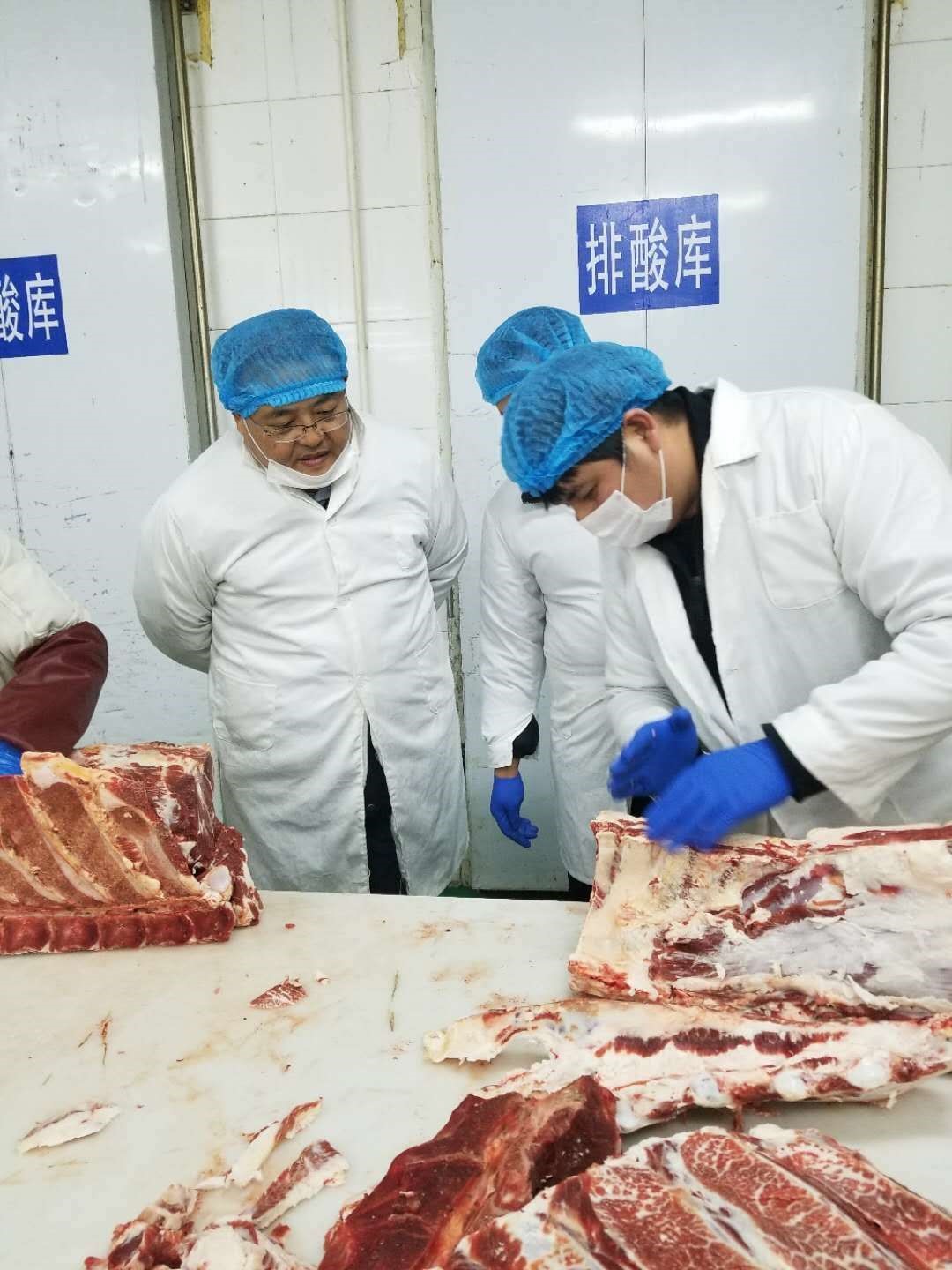 2018年1月15日,天和公司依托大厂顺泽肉类加工厂对新一批育肥牛进行屠宰和精细加工。期间有幸邀请中国肉类协会副秘书长牛羊分会秘书长高关先生,包装分会秘书长牛羊分会副会长祁丽芳女士、中国农科院北京畜牧兽医研究所畜产品加工室李海鹏老师现场操作示范牛肉分割工作。
