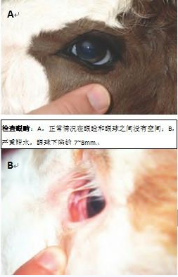 同样,在初检时要准确判断出犊牛脱水的严重程度。很简单,通过观察眼球就可以做出很准确的判断。固定头部,用拇指拨开下眼睑。正常情况下,眼球正好紧贴下眼睑,在眼球和下眼睑之间不应该有任何缝隙或距离。脱水时眼球会“皱缩”,朝头部方向下陷。当用大拇指拨开下眼睑时,会观察到在眼睑和眼球之间存在缝隙。一般来说,眼球下陷越厉害,脱水越严重。