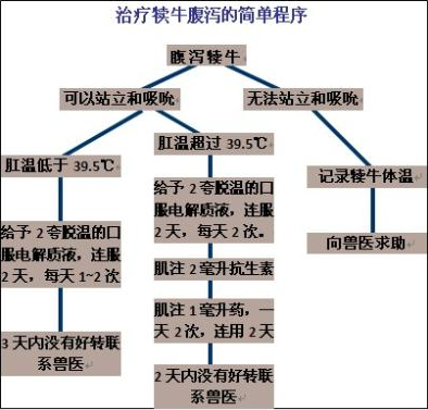 流程图显示对腹泻犊牛治疗的简单程序。该图仅是一个参考方案,不一定适应所有的牛场。鼓励和兽医一起努力经过修改建立相似的程序。及早的诊断加上恰当的治疗,大部分病例能够快速恢复。