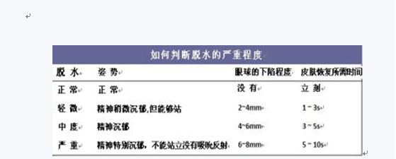 另一种判断脱水严重程度的方法就是捏住颈部的皮肤,扭转大概90度,然后松开。正常情况下,皮肤应该迅速回到原来的位置。脱水时,皮肤恢复的相当慢。表中有一些用来评估犊牛脱水的严重程度指导方针。