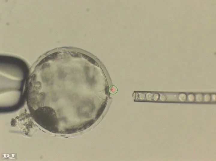 这张照片显示的是将人类的iPS细胞注射到猪囊胚中。一束激光(带红色交叉的绿色圆圈)被用来穿透猪囊胚的外膜(Zona Pellucida),以使注射针能够很容易地进入人的iPS细胞。图片版权:ofJuanCarlos Izpisua Belmonte