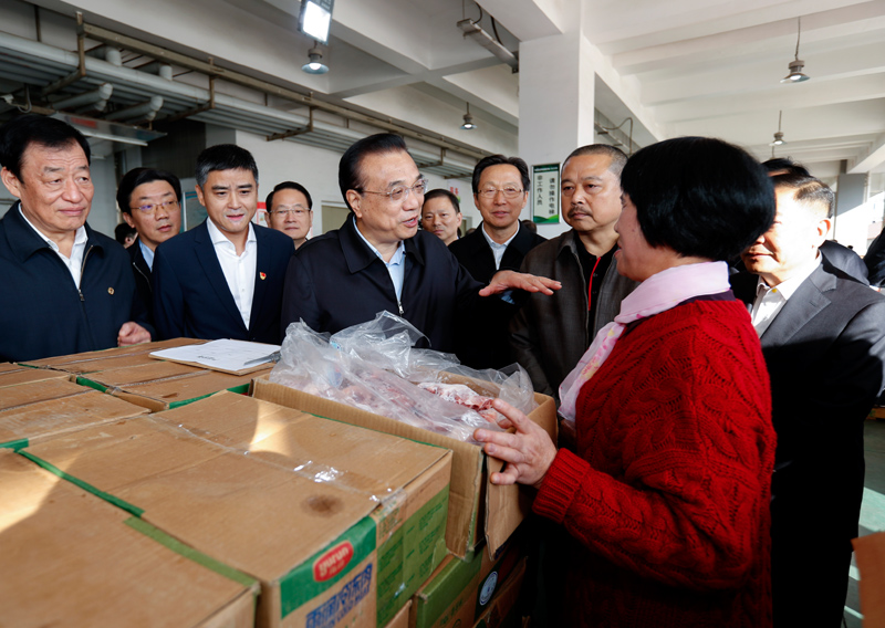 李克强11月15日上午考察江西最大的南昌深圳农产品中心批发市场,重点了解深农集团在南昌、上海、深圳、成都、西安、长沙等地市场白条猪价格走势,要求密切跟踪研判。增加冻猪肉供应对稳定市场有重要作用,总理来到冻品区,询问通过组织国内外冻猪肉货源可否满足这里的市场正常供应。有运货商反映,冻猪肉运输成本偏高是影响销售价格的因素之一。李克强要求,要研究降低高速公路冻猪肉运输收费。得知总理来了,市场内人群围拢过来,李克强对他们说,我之所以来看农产品批发市场,是因为这里对物价反应最直接,也最灵敏,对零售价格也可以发挥调节作用。你们中既有搞经销的、收购的,也有搞运输的,各级政府会想方设法降低你们的流通成本,你们也要尽力给消费者让利,我们共同努力,让千家万户的老百姓能够吃得上肉、吃得起肉,特别要保障“两节”期间猪肉的保供稳价。