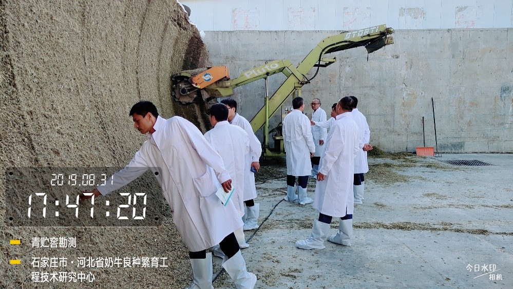 会议结束后,各位专家现场查看了天泉青贮窖青贮质量并进行了技术指导。对于现在正在使用的旧青贮,专家们提出先把现有的1100吨青贮进行裹包处理,一方面腾空青贮窖,提前3天清理干净并消毒。先用2%火碱,再用5倍稀释的碘伏彻底对青贮池消毒;另一方面,保证正常的TMR日粮供应。
