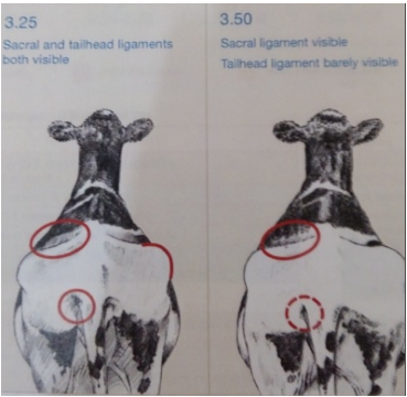 首先,从侧面看奶牛的骨盆部位。检查从坐骨—股骨结节—髂骨结节3点的角度(V/U)。这是最评分过程中最困难的地方,尤其是接近3.00或3.25分的奶牛。