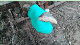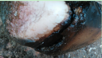 3.用0.1%高锰酸钾或0.1%新洁尔灭溶液洗净患蹄后将蹄底修平,然后沿创道修挖蹄底黑色角质或触之有弹性并有痛感的角质部,创口大小以充分暴露创腔为宜,彻底除尽坏死组织后用3%双氧水和生理盐水冲洗创腔。