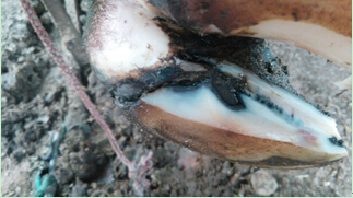 蹄底不平整,角质呈黑色。若病情进一步发展,炎性肿胀可蔓延至系部、球节或掌(趾)部,当炎症波及腱、趾(指)间韧带、冠关节或蹄关节时表现为体温升高(有时达41℃),食欲下降或废绝,精神沉郁,产奶量急剧下降,起卧困难。