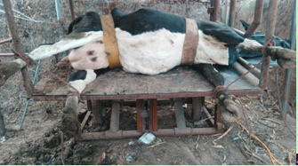 1.保定。在蹄车或者六柱栏内站立保定,用绳将牛患肢固定于同侧柱栏上,距离地面70厘米左右。