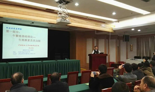 自今年8月份中心基地--河北天和肉牛养殖有限公对石家庄市地区改良站及规模养殖场繁育技术人员进行牛胚胎移植技术培训后,各地方反响良好,希望我们能再举办类似培训。11月19日,应石家庄市各市县繁育技术人员需求,基地再次举办牛育种与繁殖技术培训班。此次培训我们邀请了日本动物繁殖学会理事长前多敬一郎先生和中国动物繁殖学会理事长朱士恩教授前来授课。