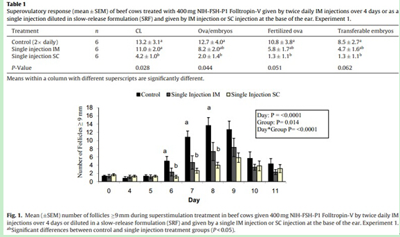 一个可选用的稳定的单次FSH注射的超排反应应该是将促卵泡素V和可生物降结合解的高分子聚合物相结合,来维持在几天内稳定慢速的释放激素。有好几种生物或合成的不同材料性质的聚合物可用于维持药物的缓慢释放,这些物质是可降解的,对生物体组织没有免疫反应,适合于在动物体内使用,其中一种就是以透明质酸为基础的物质(SRF),在以前的研究中,就将促卵泡素V用SRF稀释后单次注射进动物体,可诱发超排反应。一系列的实验设计-评估使用SRF稀释的促卵泡素V单次IM后,肉奶牛的超排反应,主要目的是确定使用SRF稀释后的促卵泡素V单次注射的位点,对超排反应的稳定性(试验1);比较两种不同浓度的SRF的IM注射结果(实验2);在安格斯奶牛上,比较注射SRF稀释后促卵泡素V和注射每日两次的生理盐水,证实前者诱发超排反应的能力。