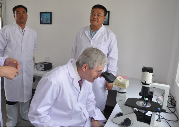 汇报结束后,大家在李树静博士的带领下参观了试验站胚胎生物技术实验室,并现场观看了肉牛体内胚胎性别鉴定技术全部操作,最后到生产区参观了种公牛、围产母牛和通过胚胎移植生产的和牛和加拿大良种奶牛等。参观结束时,大家一起合影留念。临别时,加拿大大使和石家庄市领导再次肯定石家庄综合试验站所取得的成绩,并鼓励企业再攀高峰。