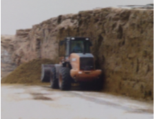 式装载机或铲车取料的,用铲车行进方向与青储面平行靠铲斗的侧面切割青储料。从青储窖或青储堆的顶部从上到下来取。